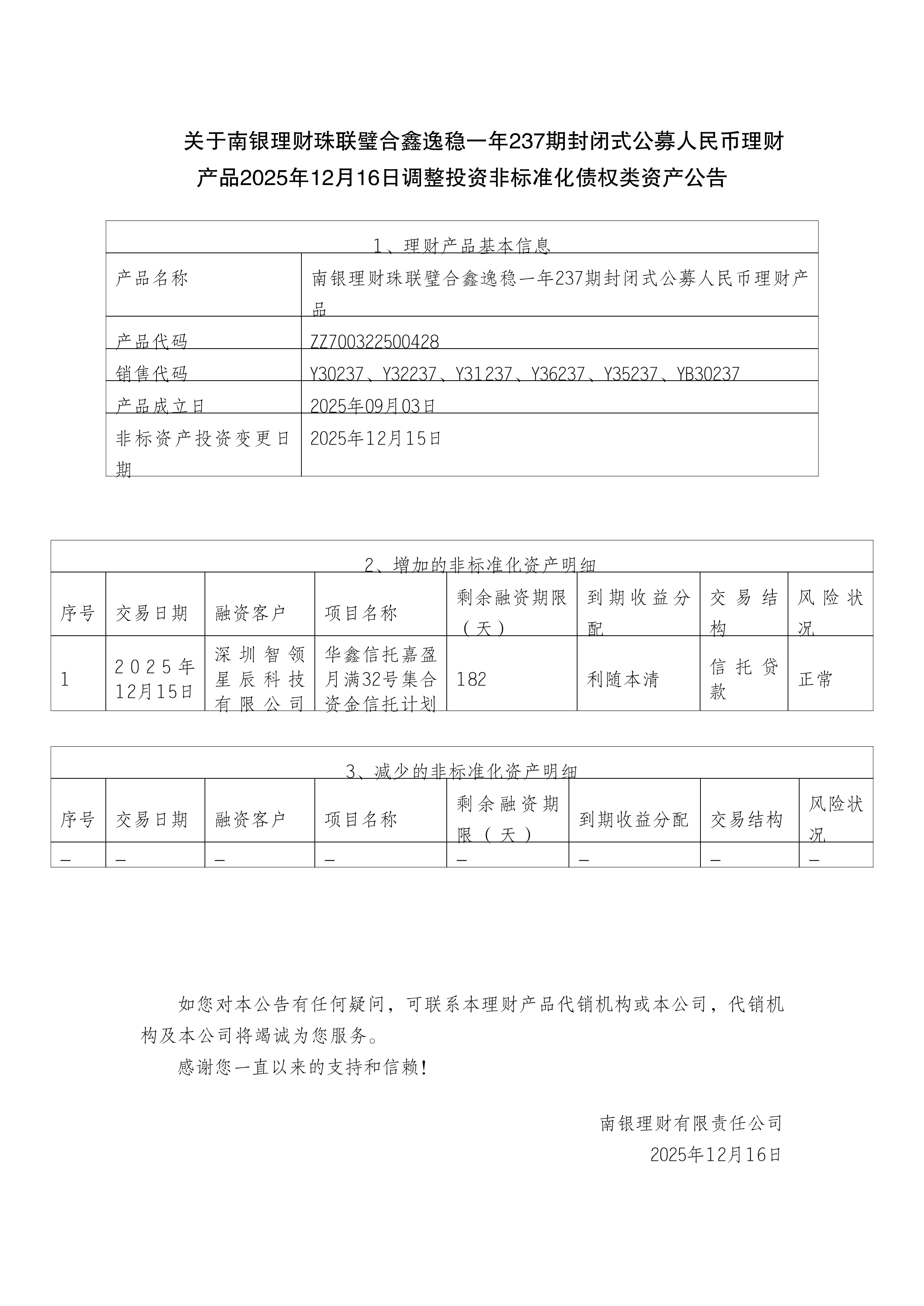 关于南银理财珠联璧合鑫逸稳一年237期封闭式公募人民币理财产品2025年12月16日调整投资非标准化债权类资产公告(2025-12-16)