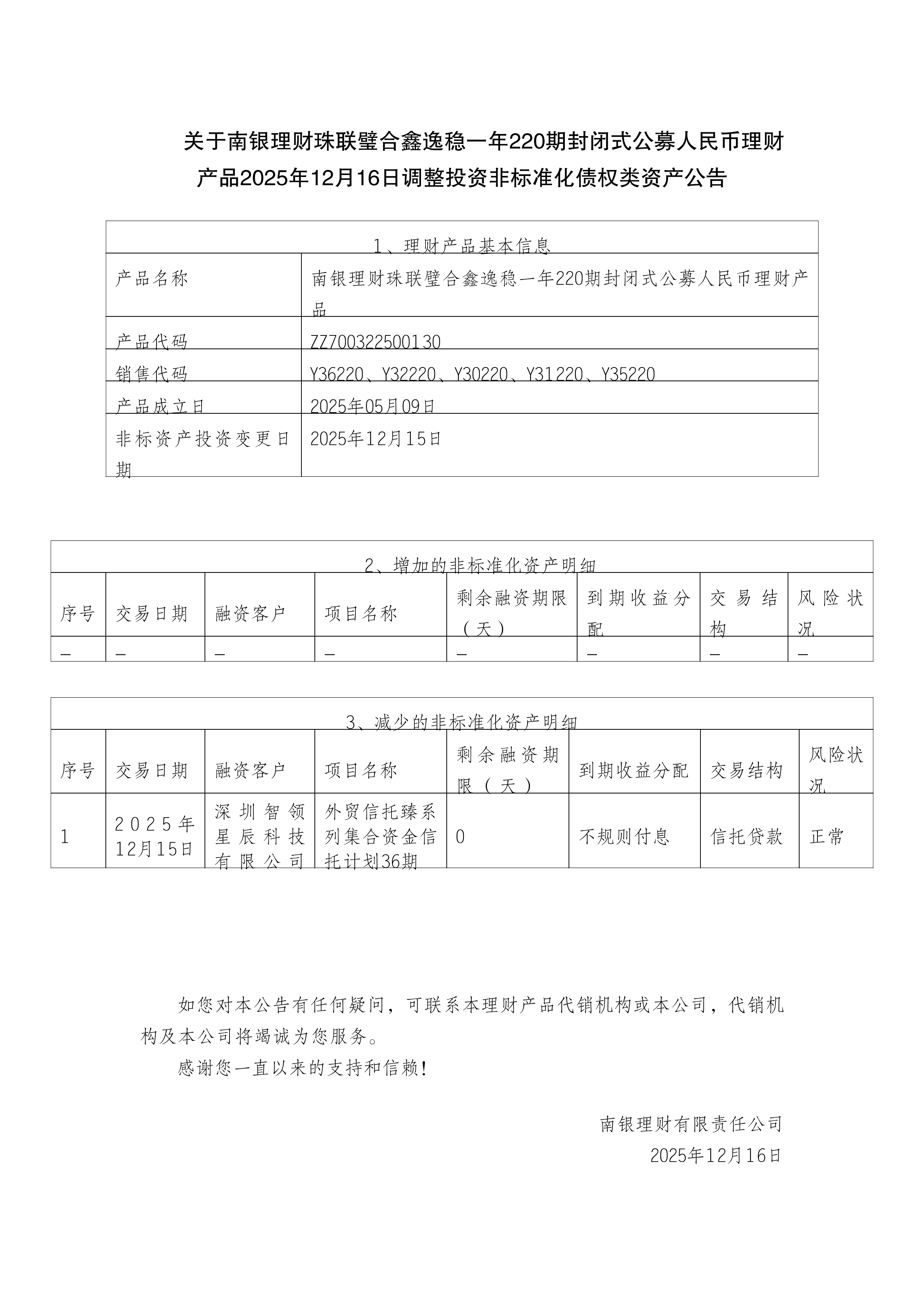关于南银理财珠联璧合鑫逸稳一年220期封闭式公募人民币理财产品2025年12月16日调整投资非标准化债权类资产公告(2025-12-16)