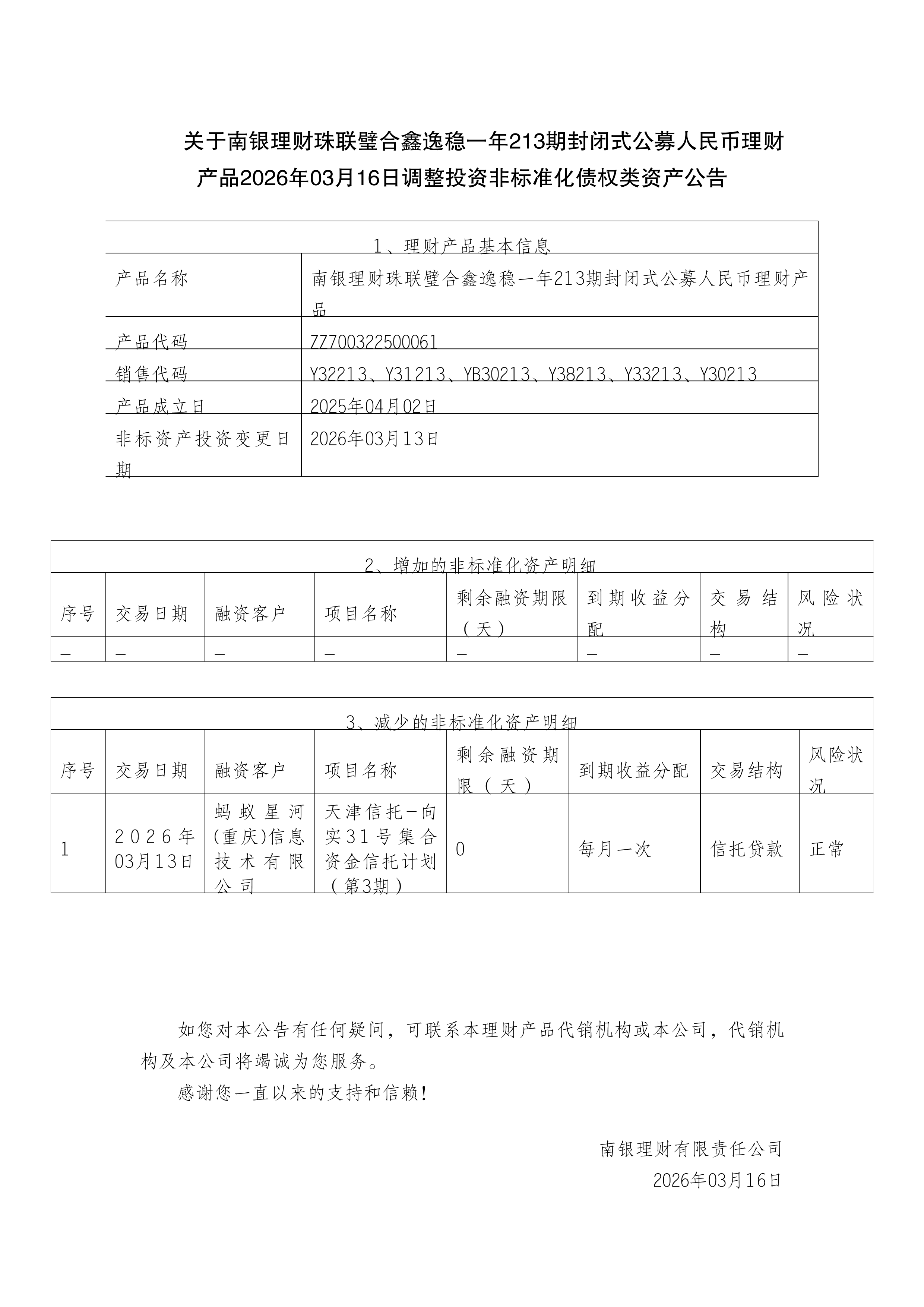 关于南银理财珠联璧合鑫逸稳一年213期封闭式公募人民币理财产品2026年03月16日调整投资非标准化债权类资产公告