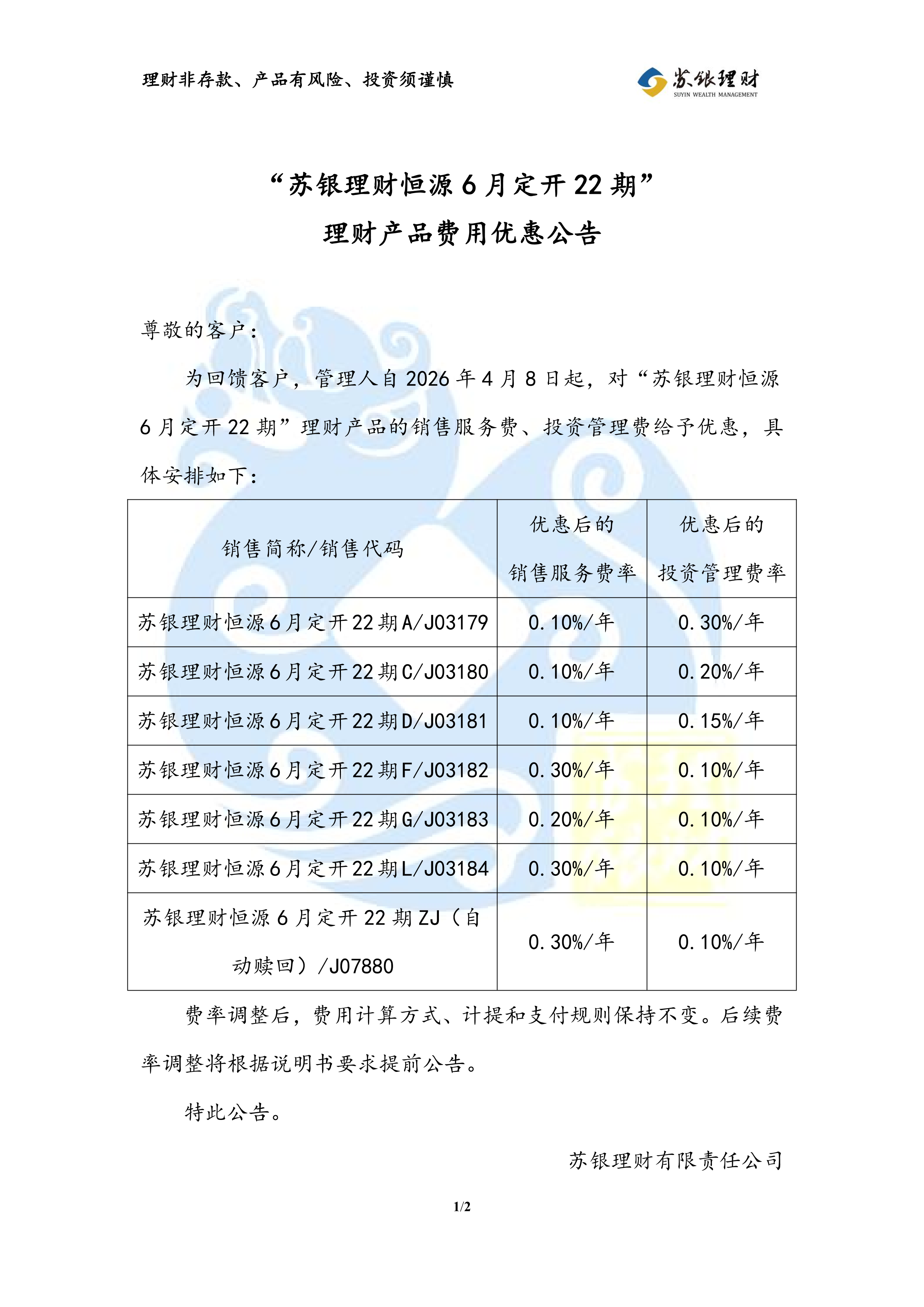 “苏银理财恒源6月定开22期”理财产品费用优惠公告(2026年4月8日执行)