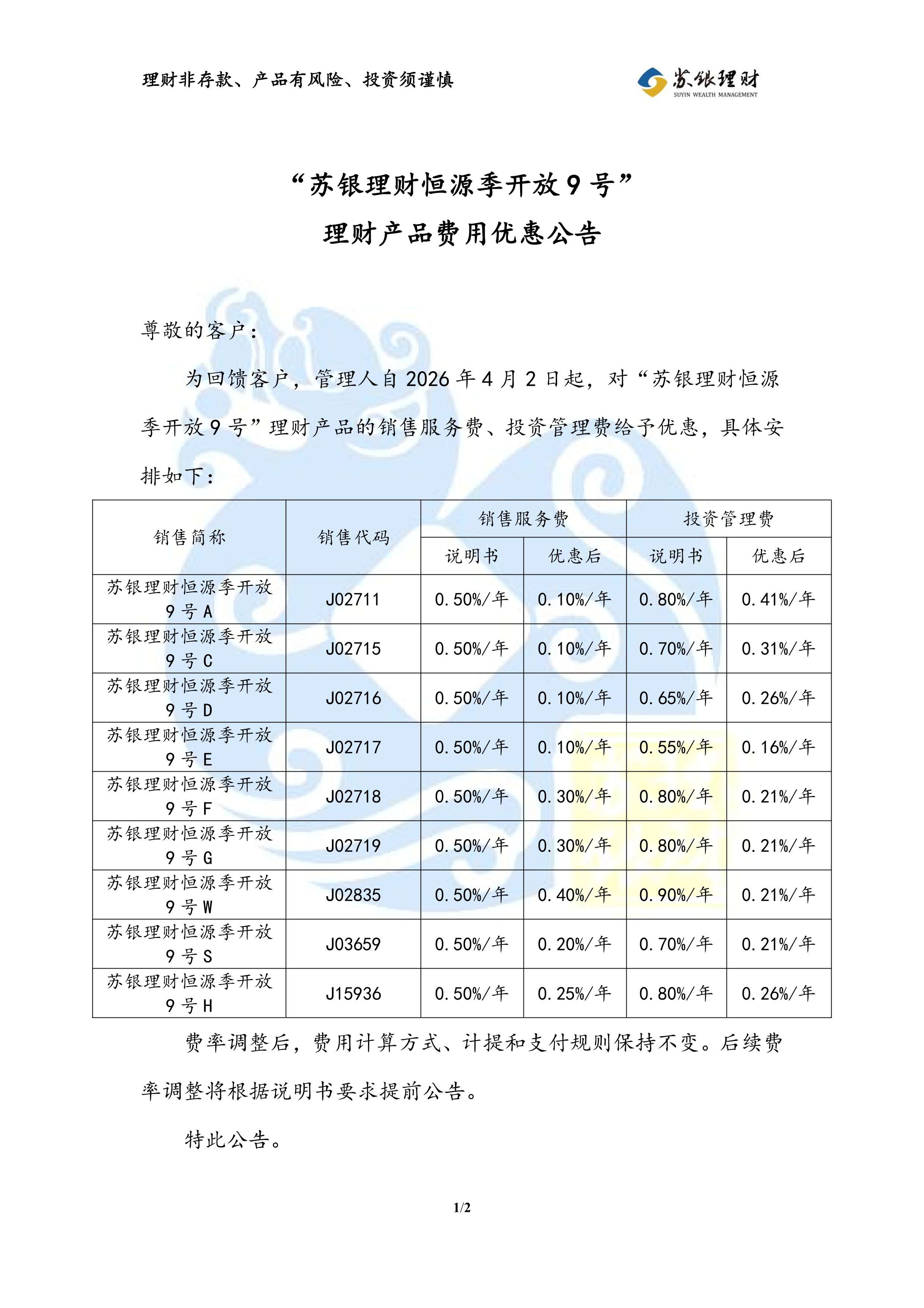 “苏银理财恒源季开放9号”理财产品费用优惠公告(2026年4月2日执行)