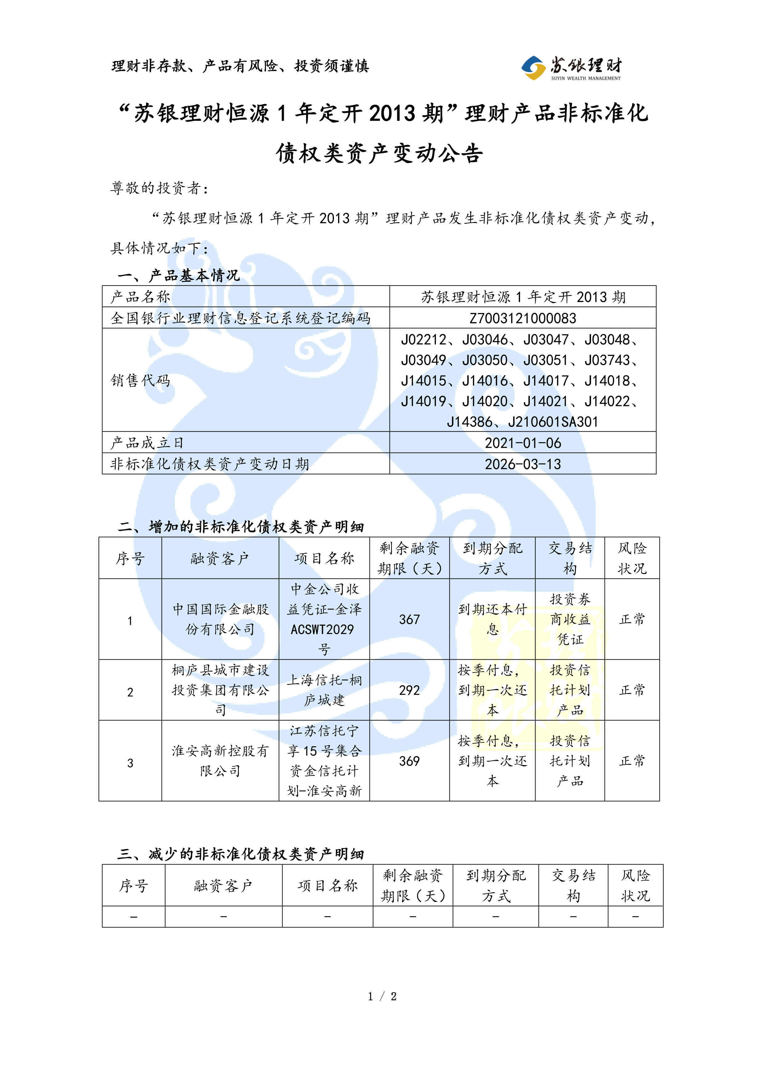 “苏银理财恒源1年定开2013期”理财产品非标准化债权类资产变动公告(2026年03月13日)
