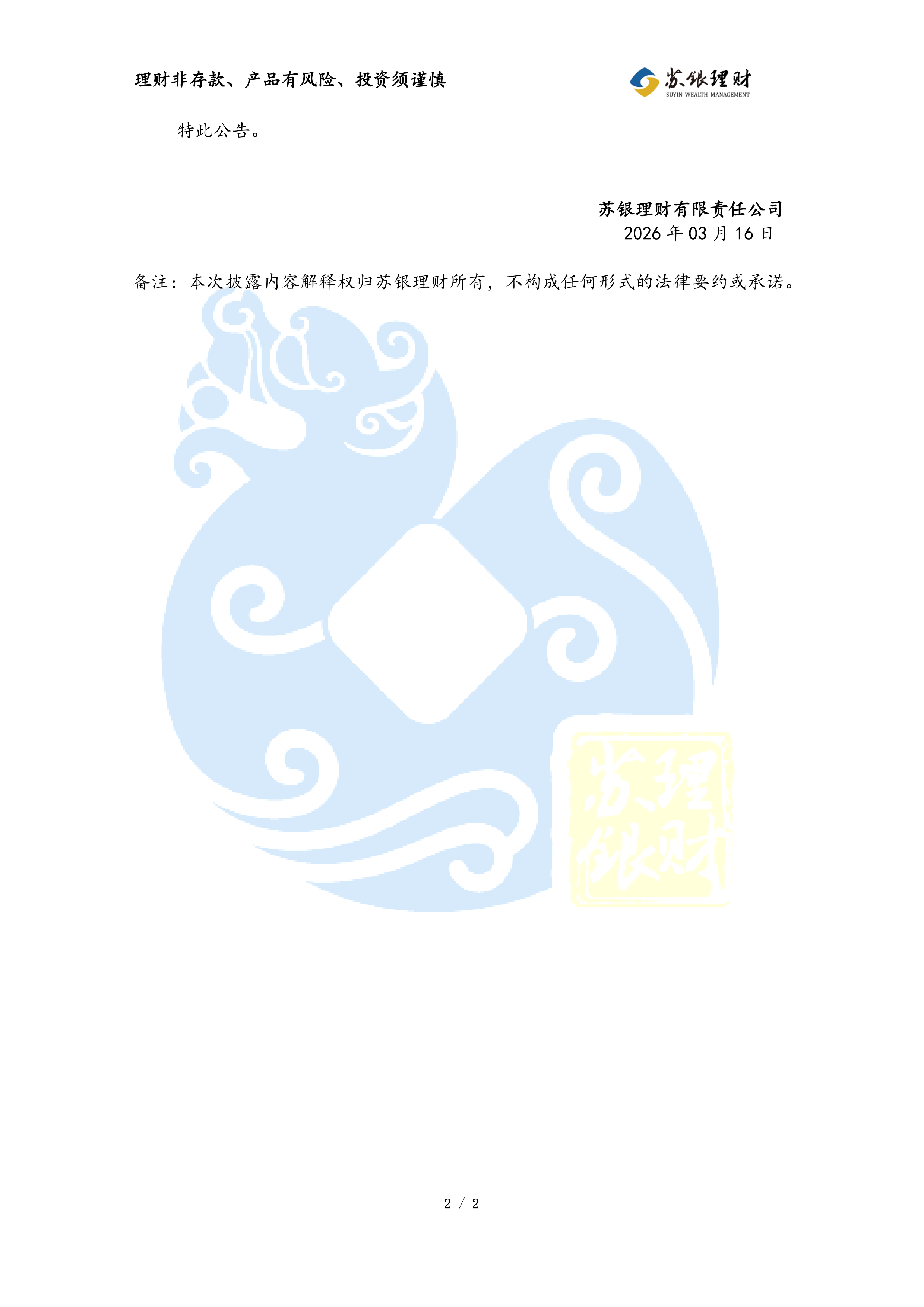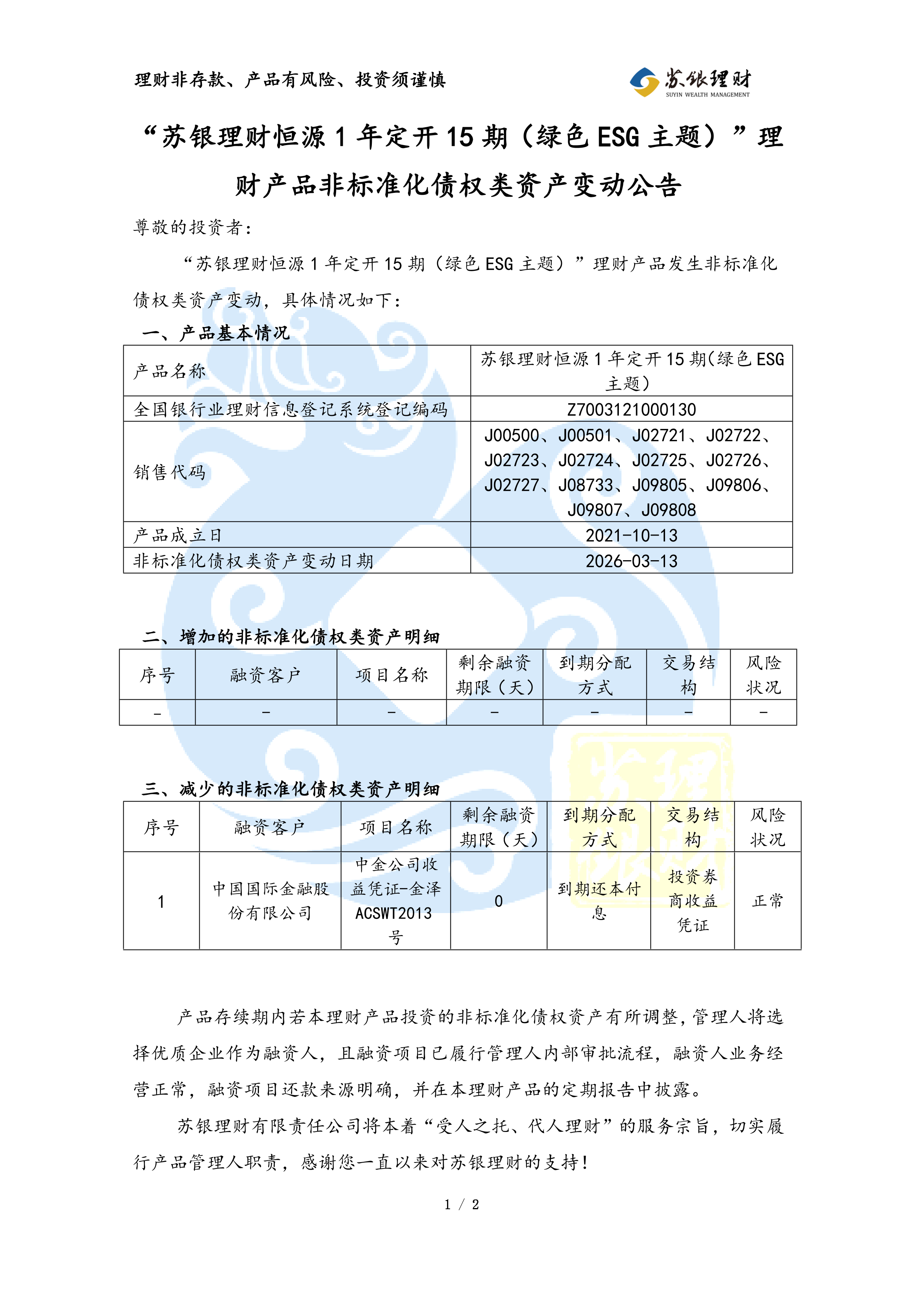 “苏银理财恒源1年定开15期(绿色ESG主题)”理财产品非标准化债权类资产变动公告(2026年03月13日)