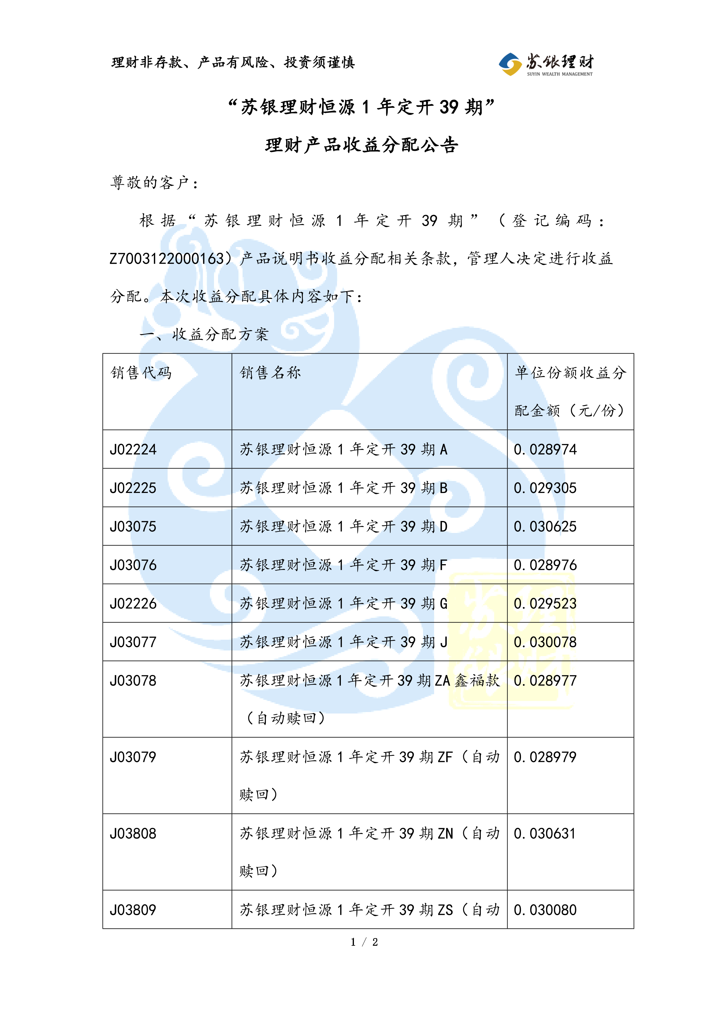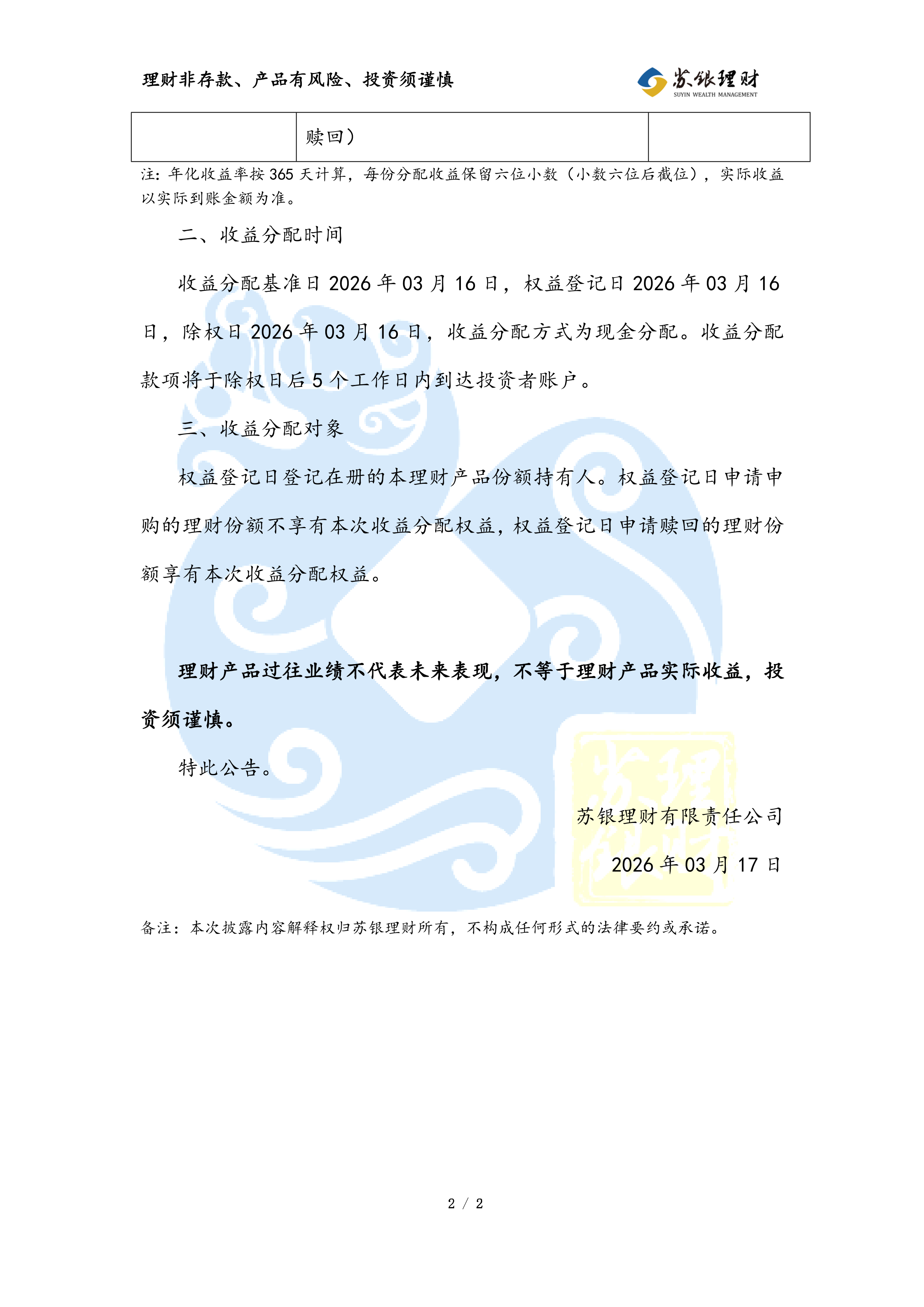 “苏银理财恒源1年定开39期”人民币理财产品收益分配公告(2026年03月17日)
